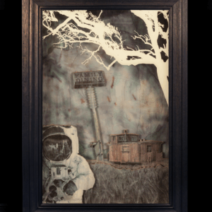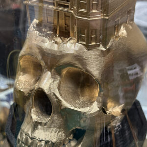 Upon the Threshold of Remembering draws us into a world where collapse is not only mourned but reimagined. Chris Boha gathers its remnants—rusted metal, scorched wood, cast glass—and reshapes them into sculptural parables and speculative fables. Each reliquary is absurd, tender, and richly layered. Drawing on Catholic iconography, climate grief, and mythic debris, Boha builds hybrid altars where saints give way to floating caravans, miniature skulls, and drifting houseboats. Humour flickers through the ruins. Play, not redemption, becomes sacred. These works invite us to dwell with what has broken, and to imagine otherwise—to tell new stories through ritual, wreckage, and irreverent grace.