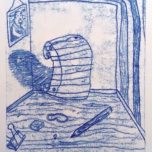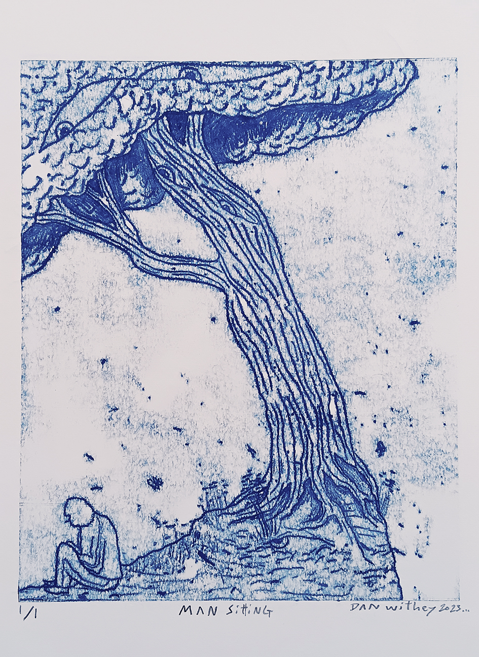 The unusual is a common sight in the paintings and monoprints of Dan Withey. In them, the ordinary is often made strange. A wind with eyes. A flower for a face. A human figure, part spider part man, drawing a miasma of the ether together like a folding of a handkerchief. The floating form of a tree hovering like a suspended boat in the air. What do they have to tell us? Things are alive.