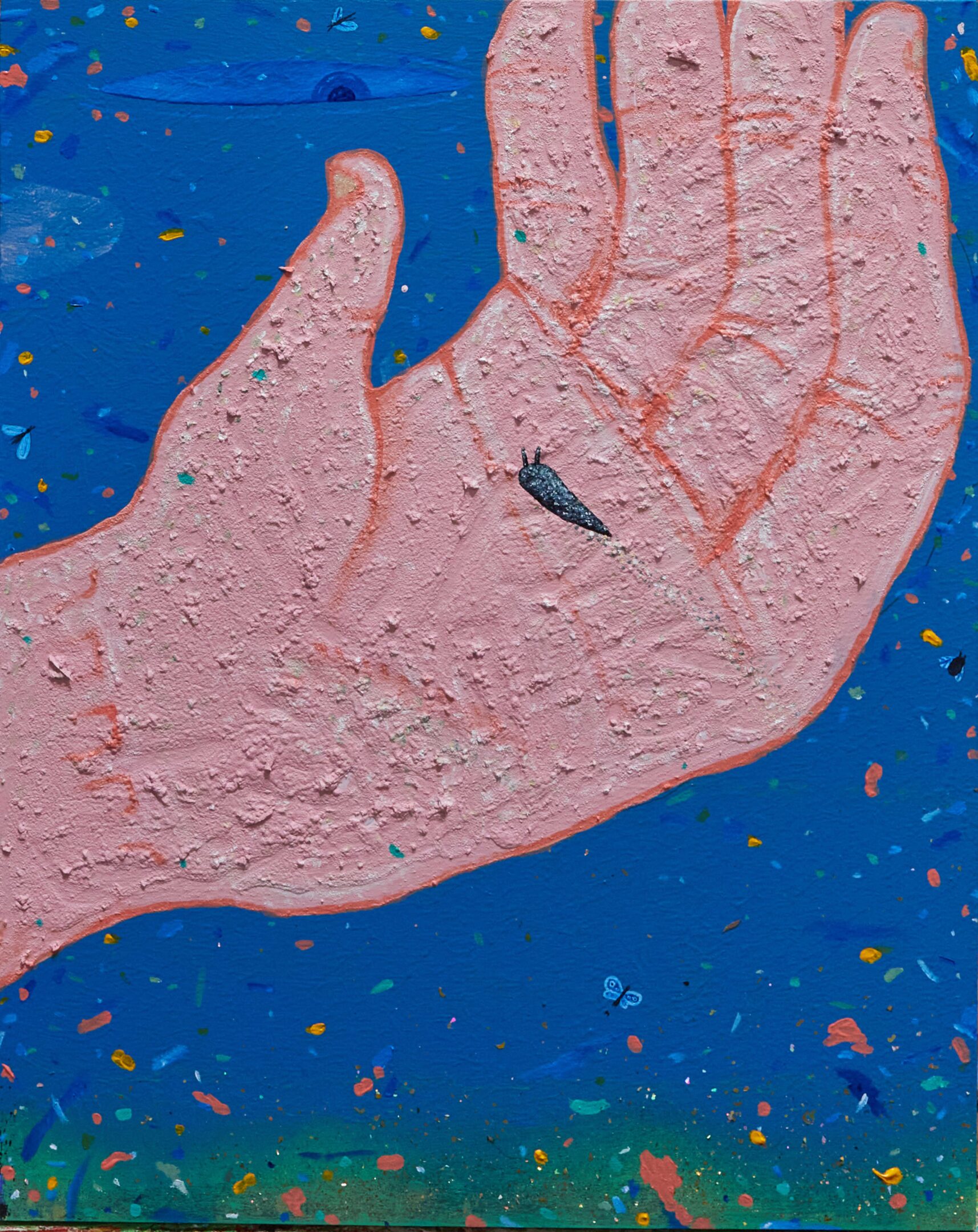 In Withey’s artwork, the world is dynamic and frequently unstable: it shifts and slides, collapses and refracts in unexpected ways. Compositionally, the works are active sites of negotiation in which opposing elements, figurative and abstract, co-exist. Converging lines and vanishing points create the illusion of space and depth but the coherence of the picture plane is always at risk of dissolving. Strong colours amplify this impression. Abundant decoration adds to the hallucinogenic effect. Withey’s paint splats and squiggles across the canvas in energetic and inquisitive loops replicating the erratic markings of beetles. Patterning erupts in all directions producing a density of surface.