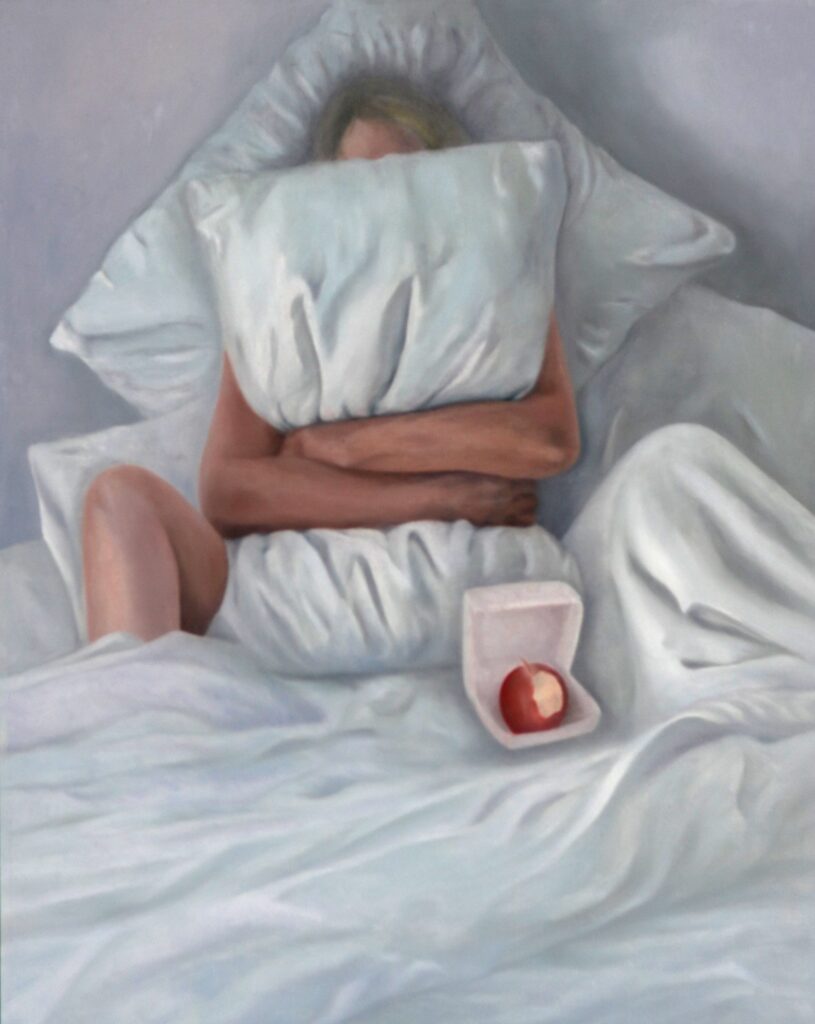 This series of intimately scaled paintings is driven by lived experience of collective isolation and the private contemporary spaces we occupy. The artist’s lived experience of insomnia transforms the sleep ritual and bedroom into zones of tension. She oscillates between desperation for sleep and feelings of dread around the long sleepless night. The works’ soft, muted palette exudes a dream-like atmosphere, while their intimate scale evokes both closeness and voyeurism.