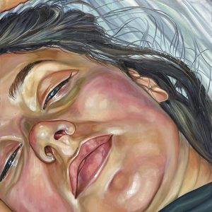In an attempt to select a ‘sample size’ for her study, Crisp released a public call-out for imagery requesting photos that had been taken ‘sneakily’ of fellow loved ones asleep (both parties consenting to the image’s use). A small selection of the extensive collection of (unknowingly captured) friends, strangers and acquaintances have been ruminated on and crafted into a series of intimate paintings that aim to highlight the extramundane in our universally shared experiences of sleep and witnessing of sleep.