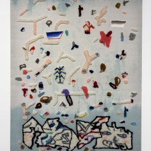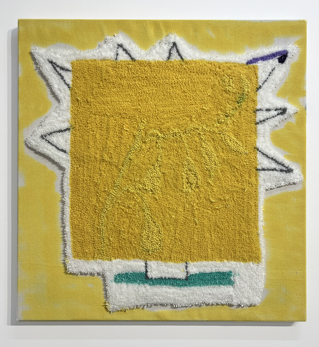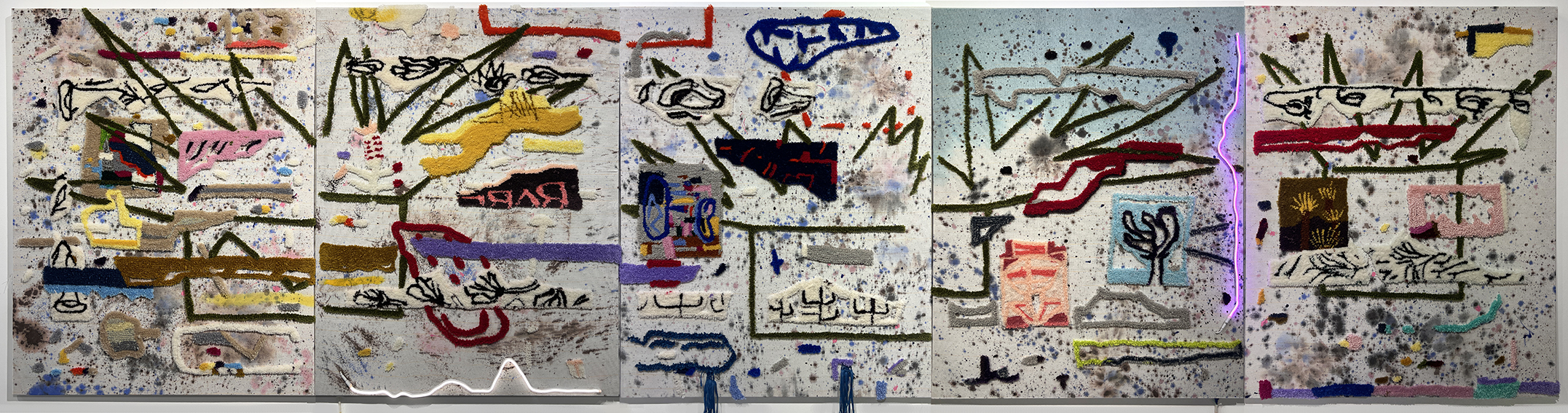 Liliana Pasalic creates abstract paintings and wall sculptures using tufted yarn, spray paint, perspex, and LED lights. Through the combination of unconventional materials, Pasalic continually seeks to redefine the boundaries of painting. The rich, tactile texture of tapestry—woven from Australian wool—invites the viewer to engage in a sensory experience, though paradoxically, the viewer is unable to touch the work! The thin, watery layers of spray paint—a visual language of the street—interact with the tufted components, merging and contrasting simultaneously. Here, tapestry is approached as a form of painting, with patches of colour added where needed and two yarn colours mixed to replicate the process in pointillist fashion. The overlapping layers, often found in traditional painting, create frames within frames, much like a collage.