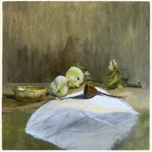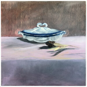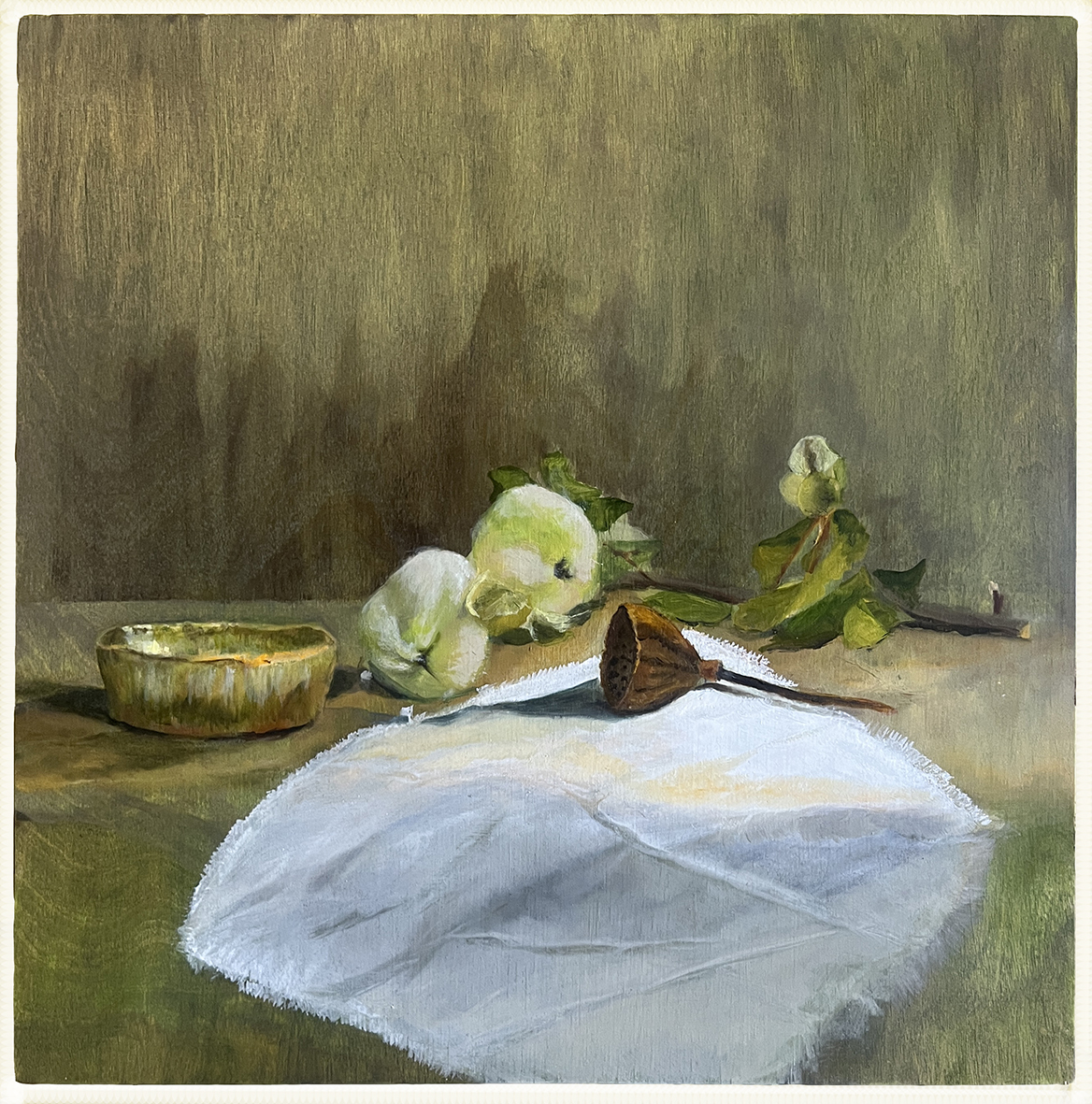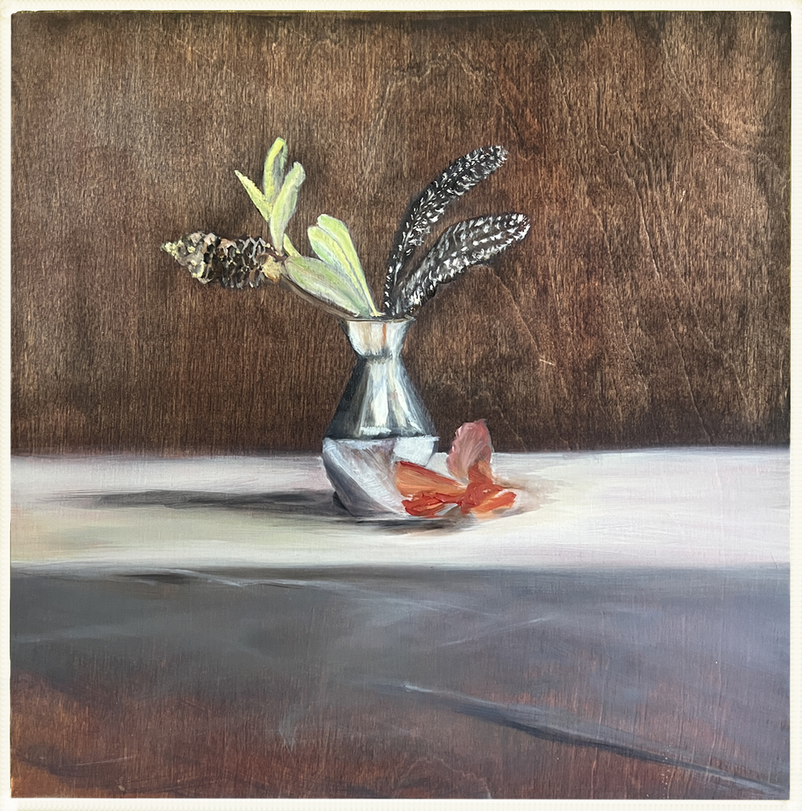Taking time to appreciate the beauty of the forms, structures, colours and textures in nature provides pause for thought and appreciation. In preparing the “In-grained” series, I purposefully selected items in my personal environment – things that I enjoy, notice and care for. Indoor plants, found objects and cuttings from bushes, trees and succulents provided subject matter for the works that I have made. Painted from life – that is by careful observation of the objects and how the light falls on, and around the staged arrangements – enabled an immediacy and sense of levity in the studies. I have chosen to paint on wood panels, first loosely coating the panels with washes of hues to enhance the chosen subject matter for the individual studies. To me, the evident wood grain provides additional texture and visual complexity.